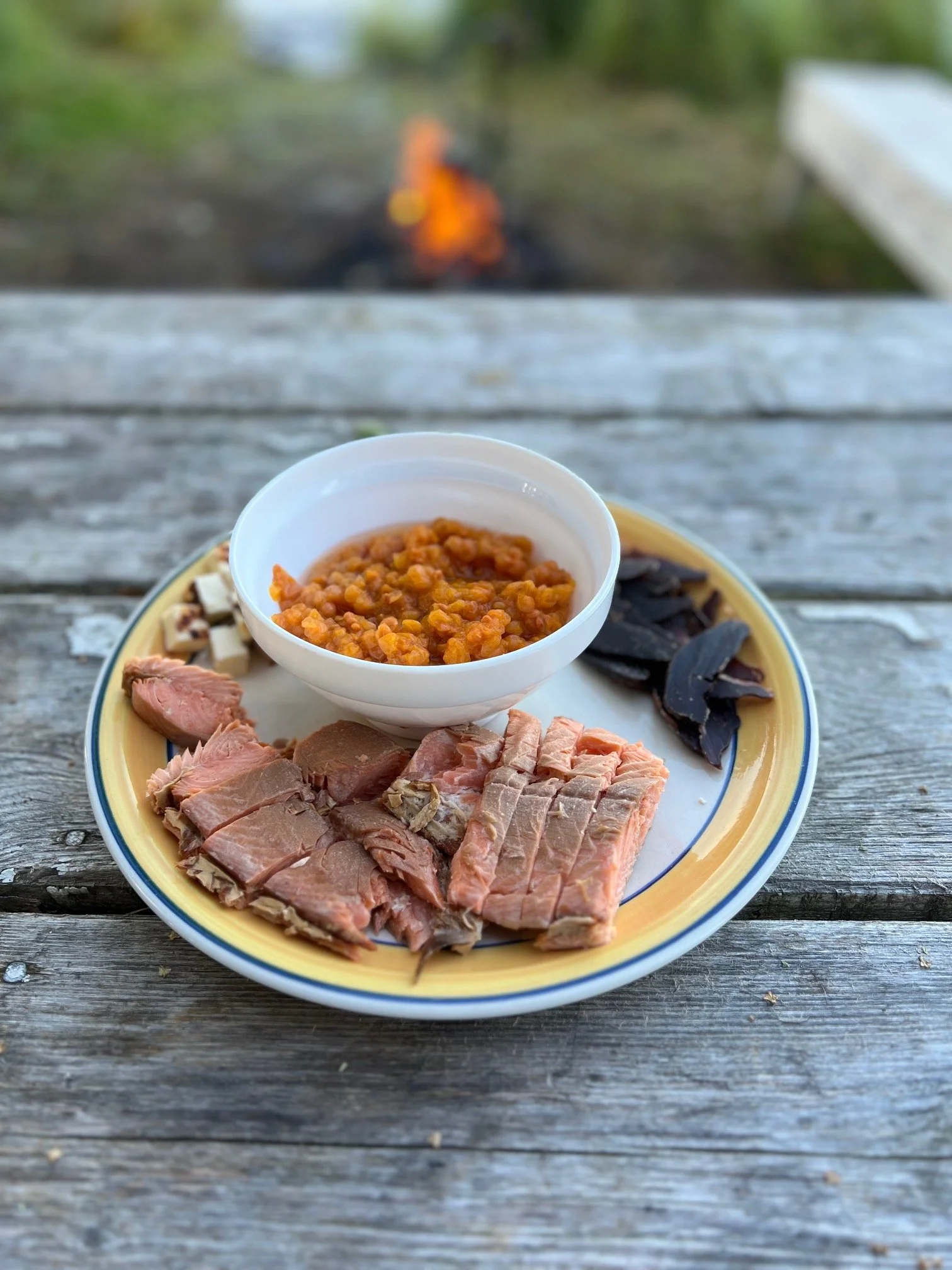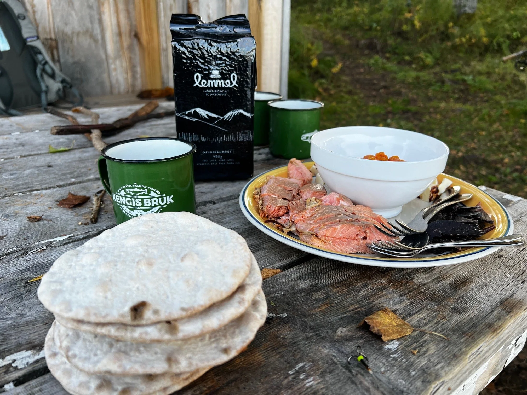Dried meat, smoked fish, local berries, crisp bread, coffee cheese and boiled coffee made over the fire was on the menu. A huge success and guests for the 2025 season can look forward to a new product to taste on the riverbank next year.