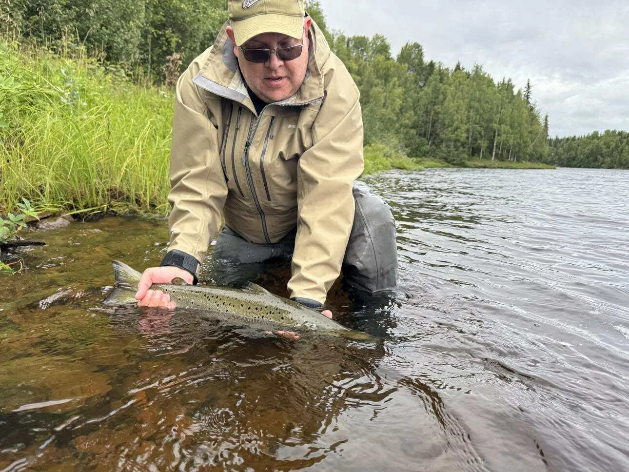 Just before packing the bags Niclas went down to zone 3 and landed another grilse, so the grilse was active in the last days of this week. It was Niclas´ second fish of the week because he landed his first salmon on fly in the warm up days in Lainio just before arriving to Kengis Bruk. Great job Niclas.